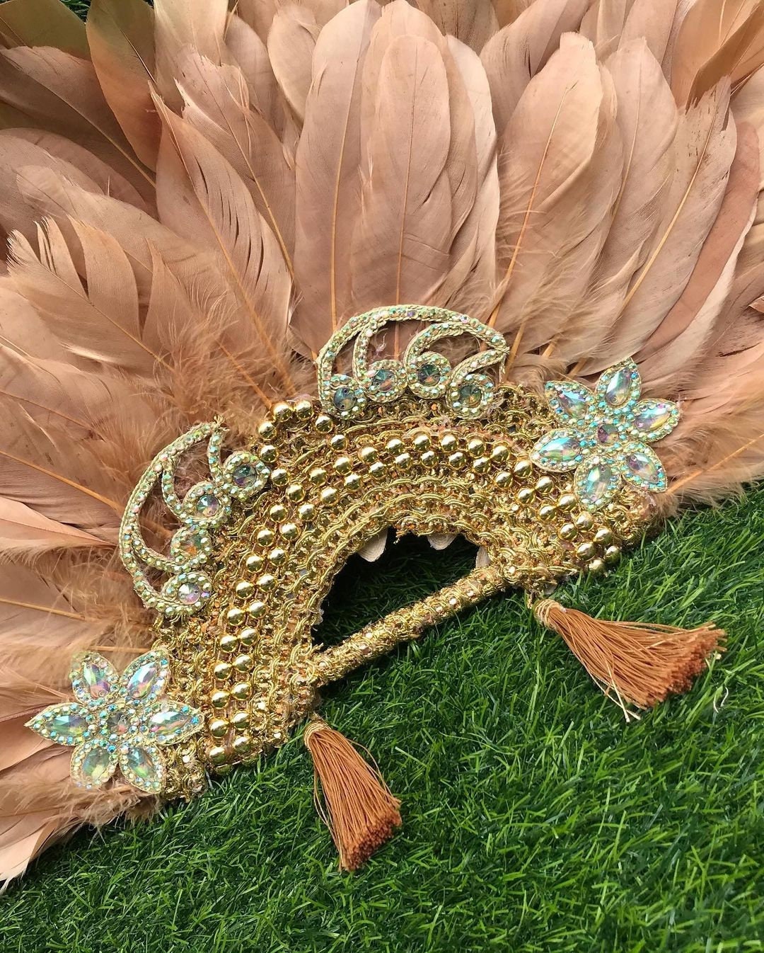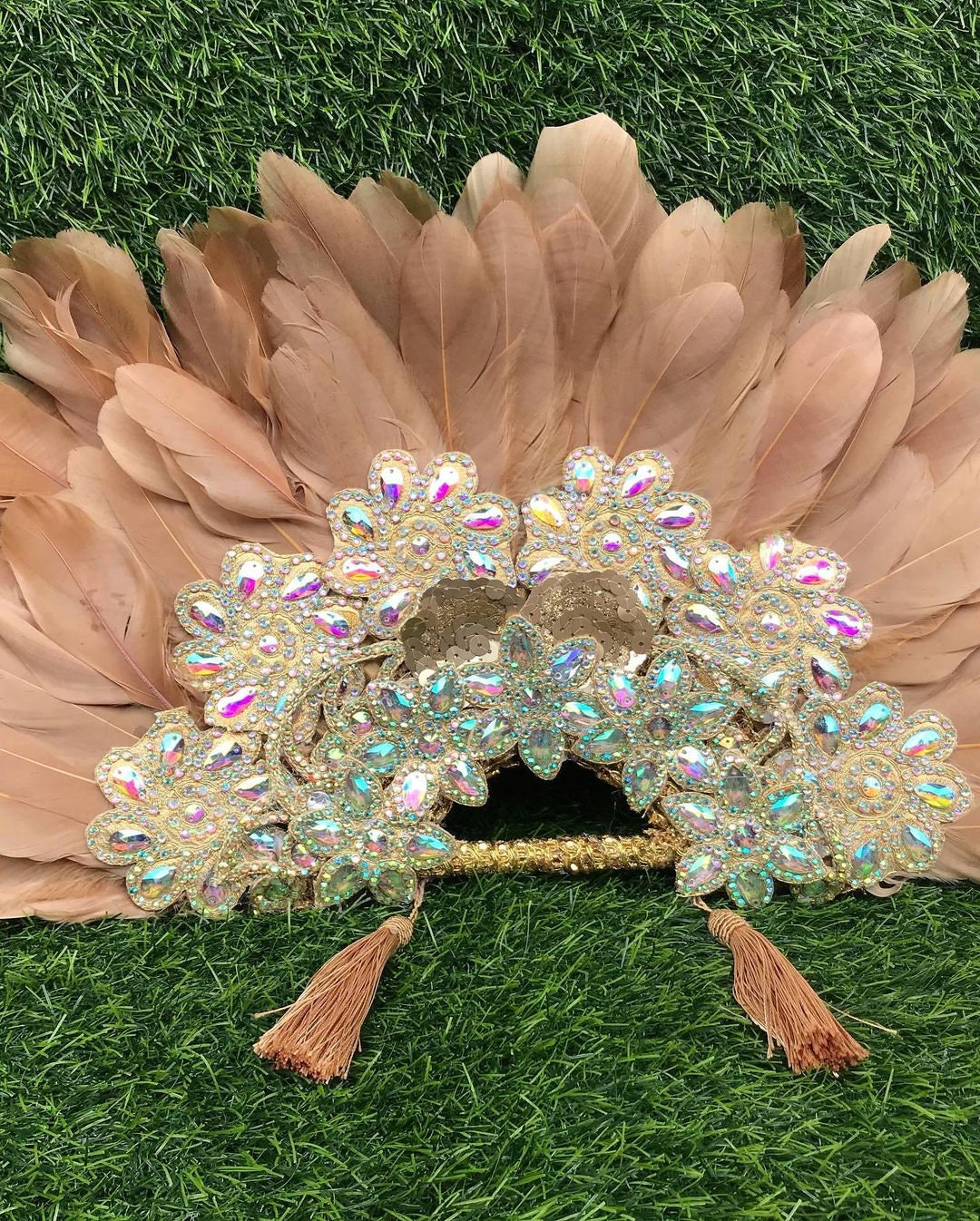 PLEASE NOTE THAT BECAUSE THIS HAND FAN IS HANDMADE AND THE DESIGN OF THE EMBROIDERY ON THE HAND FAN MAY VARY, BUT THE FEATHER COLORS REMAIN AS ORDERED.