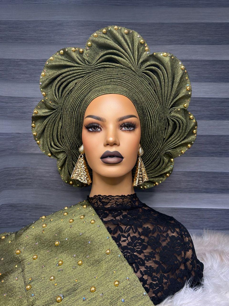 Premium Green Auto Gele – Traditional Nigerian Statement Piece.
